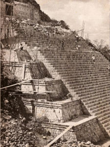 La Grande Pyramide d’Uxmal a été restaurée vers 1972 sous la direction de l’architecte César Saenz. Seule la façade nord a été restaurée, les trois autres restant recouvertes de végétation et de sédiments, comme elles l’étaient depuis des siècles. L’imposante structure se compose de neuf niveaux superposés, avec un large escalier menant à un sanctuaire dont la façade est ornée de représentations du visage de Chaac.