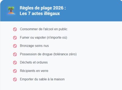 Règle officielle : consommer de l’alcool sur les plages publiques est techniquement illégal. Cela relève de la « consommation d’alcool sur la voie publique » et peut vous valoir une amende ou un séjour en cellule de dégrisement.